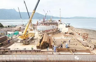 七月的驕陽炙烤大地,沿海大通道漳江灣特大橋云霄段建設(shè)工地上卻一片火熱景象。棧橋上滿載建筑材料的卡車來往穿梭,一座座大型起吊設(shè)備正繁忙運(yùn)轉(zhuǎn)著,許多頭戴安全帽、頂著烈日的工人師傅在各自崗位上緊張勞作。